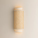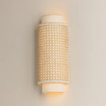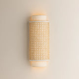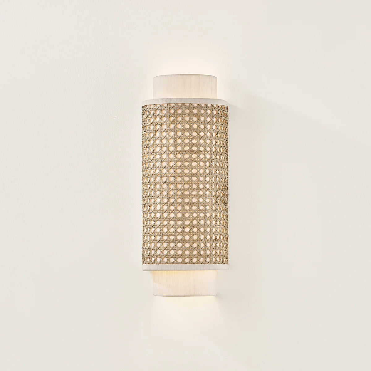 Natural materials, handcrafted detail, and soft layering create the charming and usable Tina sconce. A curved raw silk shade forms a tunnel that shields the light, while the outer basket cane wicker layer creates a textural point of interest. A warm, inviting glow fills the shade, bouncing off concealed Aged Brass hardware and softly spilling from both ends to wash the wall.