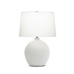 The Trudelle Table Lamp pairs a dramatic ceramic base with an off-white linen drum shade. The gently mottled white finish on the ceramic base lends a rustic appeal to the lamp that will add texture and interest to your home decor.