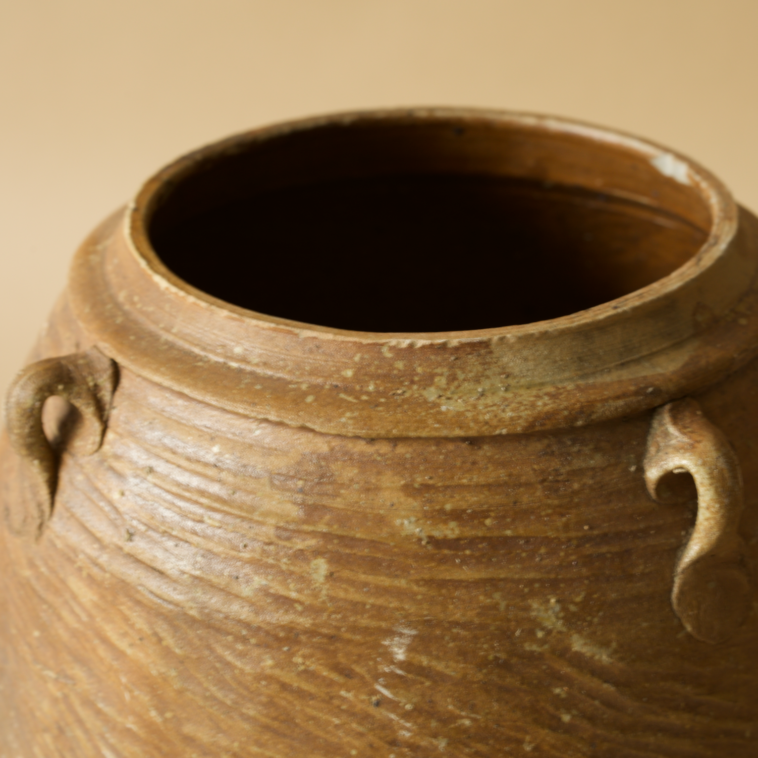 Hand-crafted and hand-glazed several decades ago, these pots boast elegant hues of taupe, delicate yellows, and rich browns. Each vessel features intricate patterns, adding a touch of enchantment to any space.